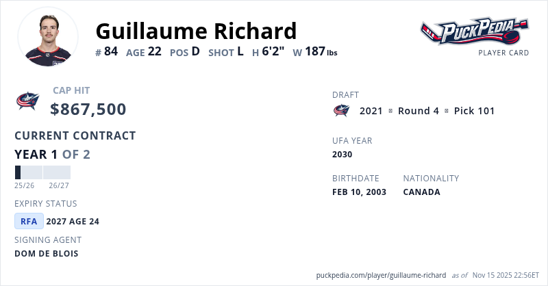 Guillaume Richard is signed to a 2 year, $1,735,000 contract with a cap hit of $867,500 per season, playing for the Columbus Blue Jackets. His contract expires at the end of the 2026-27 season, making Richard a Restricted Free Agent.