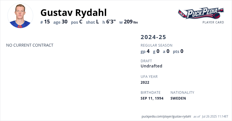 Gustav Rydahl is an Unrestricted Free Agent. His last contract was 1 year, $750,000 with a cap hit of $750,000 per season. It expired at the end of the 2022-23 season.