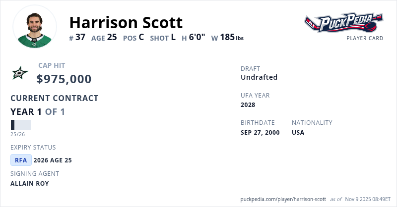Harrison Scott is signed to a 1 year, $975,000 contract with a cap hit of $975,000 per season, playing for the Dallas Stars. His contract expires at the end of the 2025-26 season, making Scott a Restricted Free Agent.