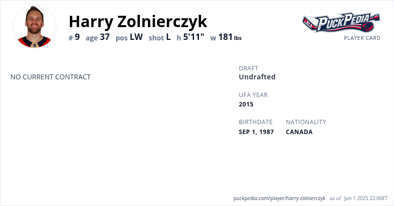 Harry Zolnierczyk is an Unrestricted Free Agent. His last contract was 1 year, $650,000 with a cap hit of $650,000 per season. It expired at the end of the 2017-18 season.