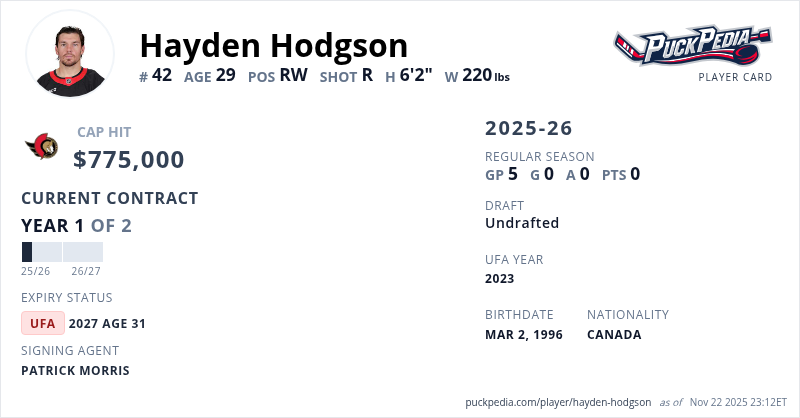 Hayden Hodgson is signed to a 2 year, $1,550,000 contract with a cap hit of $775,000 per season, playing for the Ottawa Senators. His contract expires at the end of the 2026-27 season, making Hodgson an Unrestricted Free Agent.