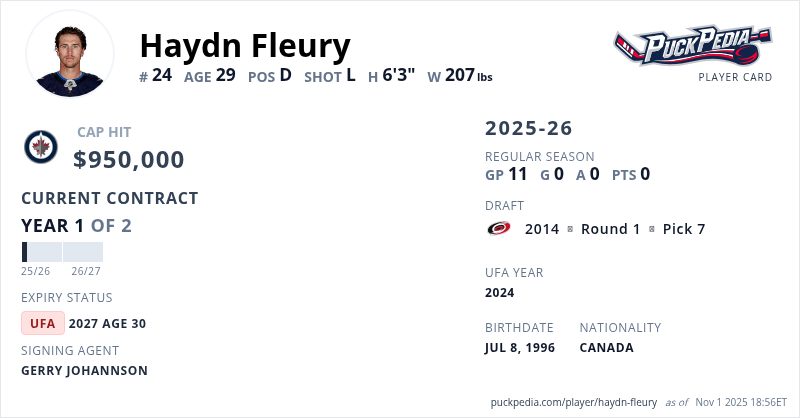 Haydn Fleury is signed to a 2 year, $1,900,000 contract with a cap hit of $950,000 per season, playing for the Winnipeg Jets. His contract expires at the end of the 2026-27 season, making Fleury an Unrestricted Free Agent.
