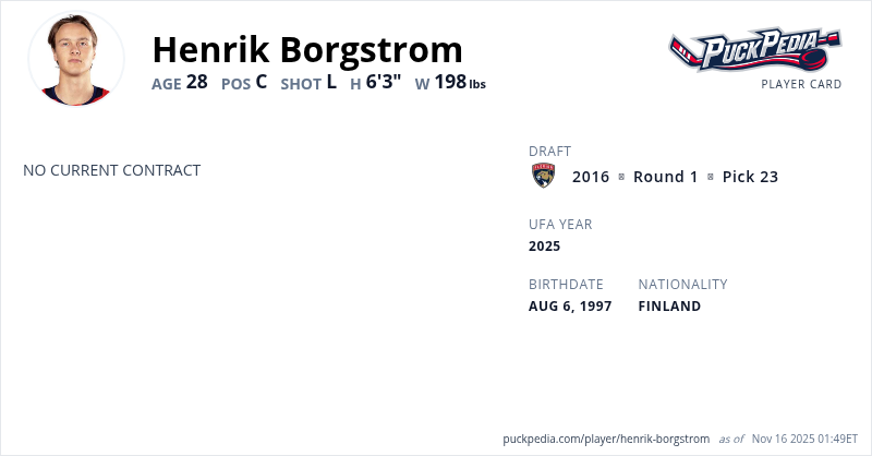 Henrik Borgstrom is a Restricted Free Agent. His last contract was 1 year, $750,000 with a cap hit of $750,000 per season. It expired at the end of the 2022-23 season.