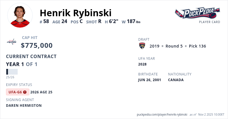 Henrik Rybinski is signed to a 1 year, $775,000 contract with a cap hit of $775,000 per season, playing for the Washington Capitals. His contract expires at the end of the 2025-26 season, making Rybinski an Unrestricted Free Agent (Group 6).