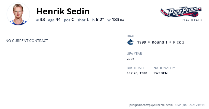 Henrik Sedin is an Unrestricted Free Agent. His last contract was 4 years, $28,000,000 with a cap hit of $7,000,000 per season. It expired at the end of the 2017-18 season.