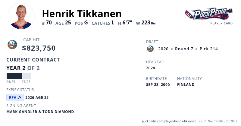 Henrik Tikkanen is signed to a 2 year, $1,647,500 contract with a cap hit of $823,750 per season, playing for the New York Islanders. His contract expires at the end of the 2025-26 season, making Tikkanen a Restricted Free Agent.