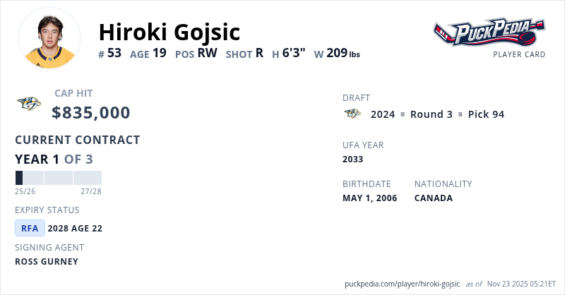 Hiroki Gojsic is signed to a 3 year, $2,505,000 contract with a cap hit of $835,000 per season, playing for the Nashville Predators. His contract expires at the end of the 2027-28 season, making Gojsic a Restricted Free Agent.