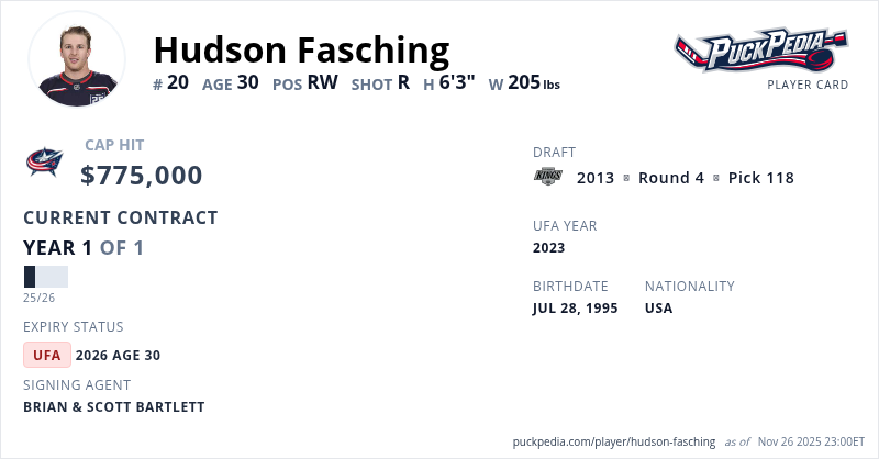 Hudson Fasching is signed to a 1 year, $775,000 contract with a cap hit of $775,000 per season, playing for the Columbus Blue Jackets. His contract expires at the end of the 2025-26 season, making Fasching an Unrestricted Free Agent.
