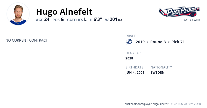 Hugo Alnefelt is a Restricted Free Agent. His last contract was 3 years, $2,552,499 with a cap hit of $850,833 per season. It expired at the end of the 2023-24 season.