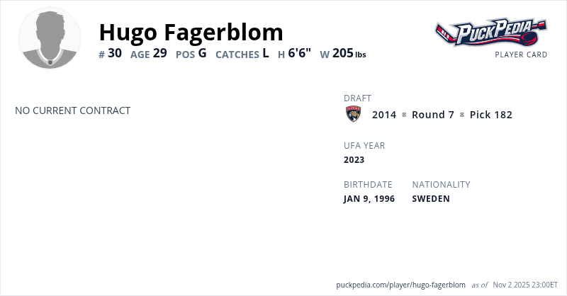 | 2023-24 | 27 | HockeyEttan | Borås HC | 12 | 2.7 | 0.895 | 0 | |||||||||||||||||||||||