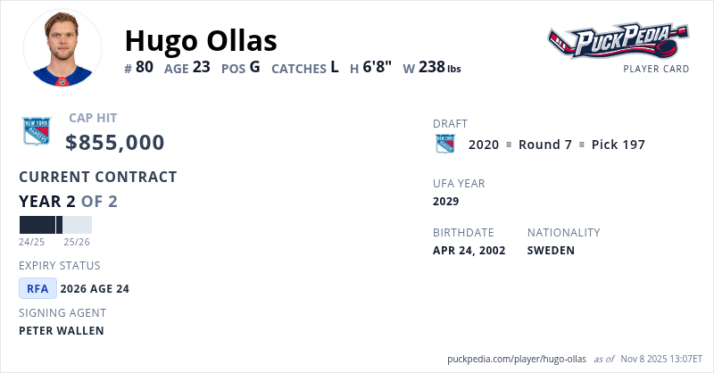 Hugo Ollas is signed to a 2 year, $1,710,000 contract with a cap hit of $855,000 per season, playing for the New York Rangers. His contract expires at the end of the 2025-26 season, making Ollas a Restricted Free Agent.