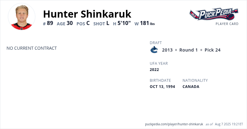 Hunter Shinkaruk is an Unrestricted Free Agent (No Qualifying Offer). His last contract was 1 year, $650,000 with a cap hit of $650,000 per season. It expired at the end of the 2018-19 season.