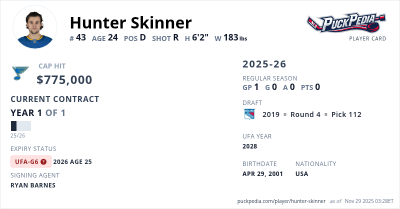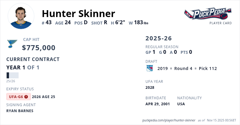 Hunter Skinner is signed to a 1 year, $775,000 contract with a cap hit of $775,000 per season, playing for the St. Louis Blues. His contract expires at the end of the 2025-26 season, making Skinner an Unrestricted Free Agent (Group 6).