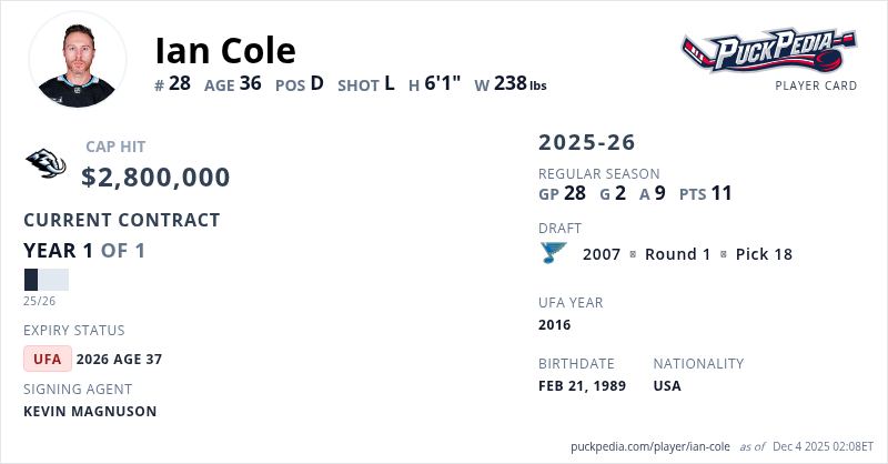 Ian Cole is signed to a 1 year, $2,800,000 contract with a cap hit of $2,800,000 per season, playing for the Utah Mammoth. His contract expires at the end of the 2025-26 season, making Cole an Unrestricted Free Agent.