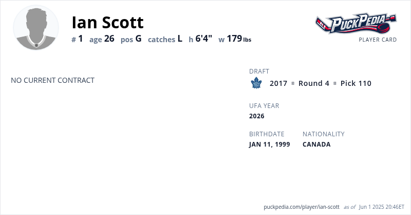Ian Scott is an Unrestricted Free Agent (No Qualifying Offer). His last contract was 3 years, $2,417,502 with a cap hit of $805,834 per season. It expired at the end of the 2021-22 season.