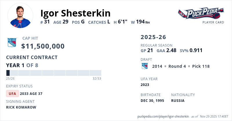 Igor Shesterkin is signed to a 8 year, $92,000,000 contract with a cap hit of $11,500,000 per season, playing for the New York Rangers. His contract expires at the end of the 2032-33 season, making Shesterkin an Unrestricted Free Agent.