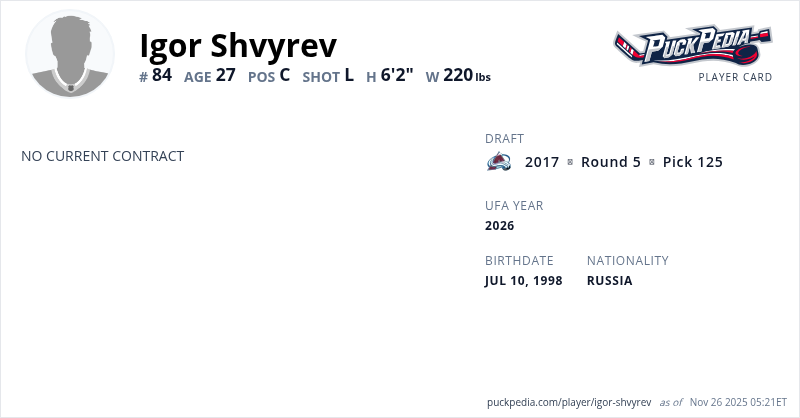 Igor Shvyrev is a Restricted Free Agent. His last contract was 3 years, $2,327,499 with a cap hit of $775,833 per season. It expired at the end of the 2020-21 season.