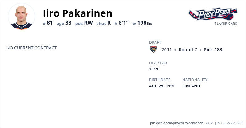 Iiro Pakarinen is an Unrestricted Free Agent. His last contract was 1 year, $725,000 with a cap hit of $725,000 per season. It expired at the end of the 2017-18 season.
