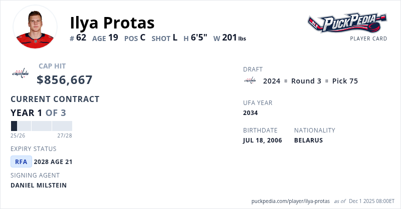 Ilya Protas is signed to a 3 year, $2,570,001 contract with a cap hit of $856,667 per season, playing for the Washington Capitals. His contract expires at the end of the 2027-28 season, making Protas a Restricted Free Agent.