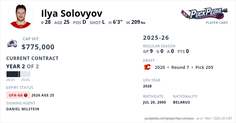 Ilya Solovyov is signed to a 2 year, $1,550,000 contract with a cap hit of $775,000 per season, playing for the Colorado Avalanche. His contract expires at the end of the 2025-26 season, making Solovyov an Unrestricted Free Agent (Group 6).