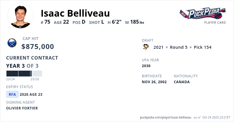 Isaac Belliveau is signed to a 3 year, $2,625,000 contract with a cap hit of $875,000 per season, playing for the Buffalo Sabres. His contract expires at the end of the 2025-26 season, making Belliveau a Restricted Free Agent.