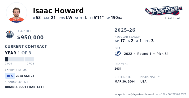 Isaac Howard is signed to a 3 year, $2,850,000 contract with a cap hit of $950,000 per season, playing for the Edmonton Oilers. His contract expires at the end of the 2027-28 season, making Howard a Restricted Free Agent.