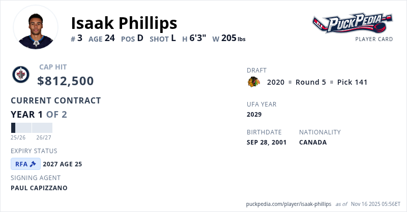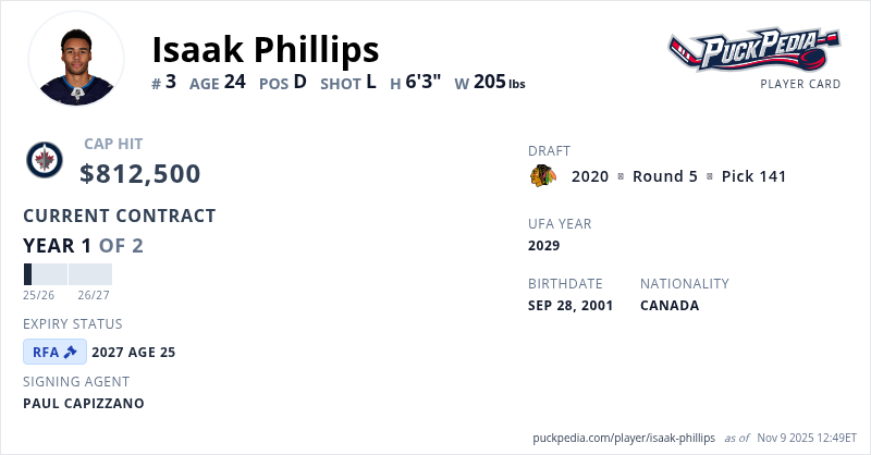 Isaak Phillips is signed to a 2 year, $1,625,000 contract with a cap hit of $812,500 per season, playing for the Winnipeg Jets. His contract expires at the end of the 2026-27 season, making Phillips a Restricted Free Agent.