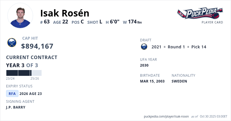 Isak Rosén is signed to a 3 year, $2,682,501 contract with a cap hit of $894,167 per season, playing for the Buffalo Sabres. His contract expires at the end of the 2025-26 season, making Rosén a Restricted Free Agent.