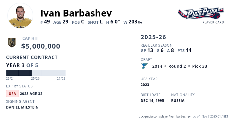 Ivan Barbashev is signed to a 5 year, $25,000,000 contract with a cap hit of $5,000,000 per season, playing for the Vegas Golden Knights. His contract expires at the end of the 2027-28 season, making Barbashev an Unrestricted Free Agent.