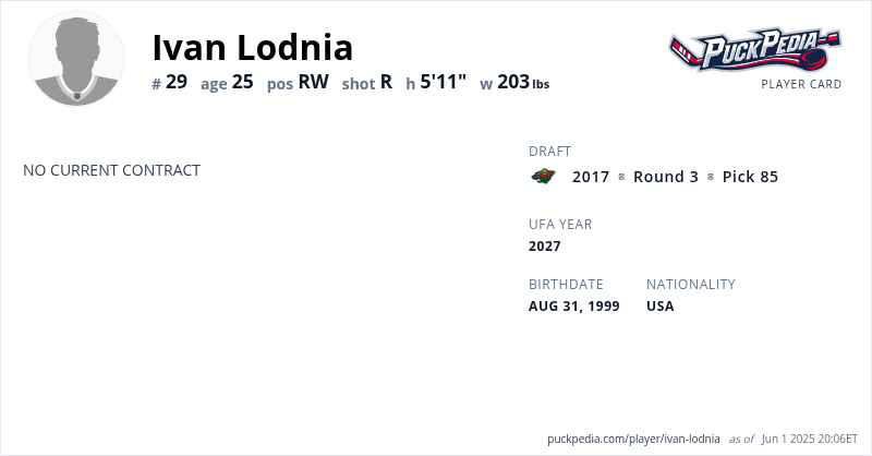 Ivan Lodnia is a Restricted Free Agent. His last contract was 4 years, $3,020,208 with a cap hit of $755,052 per season. It expired at the end of the 2021-22 season.