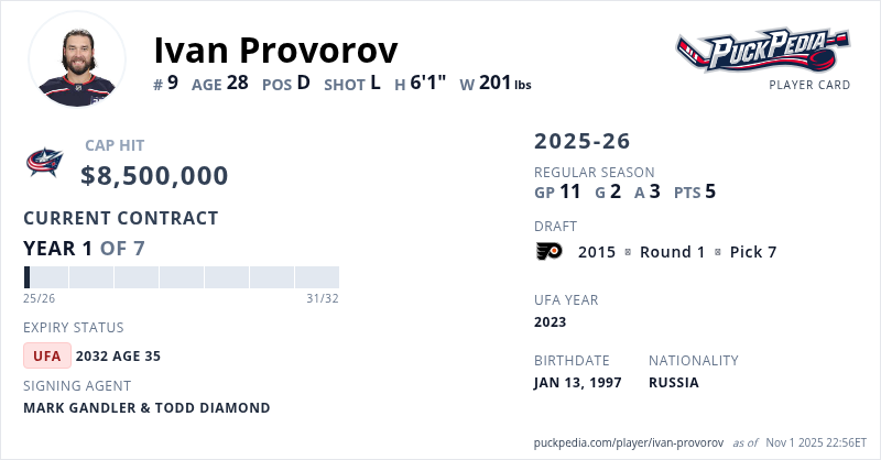 Ivan Provorov is signed to a 7 year, $59,500,000 contract with a cap hit of $8,500,000 per season, playing for the Columbus Blue Jackets. His contract expires at the end of the 2031-32 season, making Provorov an Unrestricted Free Agent.