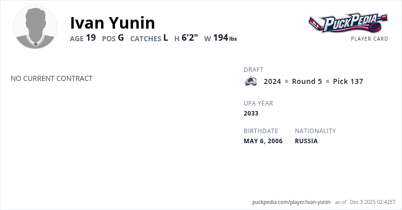 | 2023-24 | 17 | VHL | Omskie Krylia | 0 | 0.000 | 0 | ||||||||||||||||||||||||