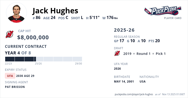 Jack Hughes is signed to a 8 year, $64,000,000 contract with a cap hit of $8,000,000 per season, playing for the New Jersey Devils. His contract expires at the end of the 2029-30 season, making Hughes an Unrestricted Free Agent.