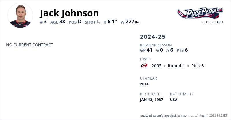 Jack Johnson is an Unrestricted Free Agent. His last contract was 1 year, $775,000 with a cap hit of $775,000 per season. It expired at the end of the 2024-25 season.
