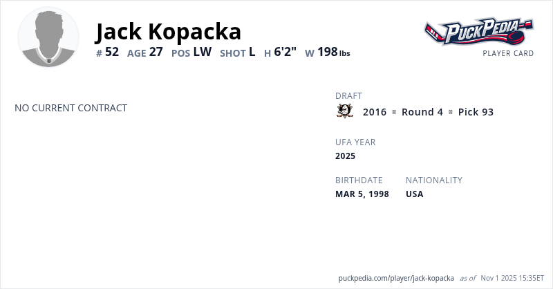 Jack Kopacka is an Unrestricted Free Agent (No Qualifying Offer). His last contract was 3 years, $2,235,000 with a cap hit of $745,000 per season. It expired at the end of the 2020-21 season.