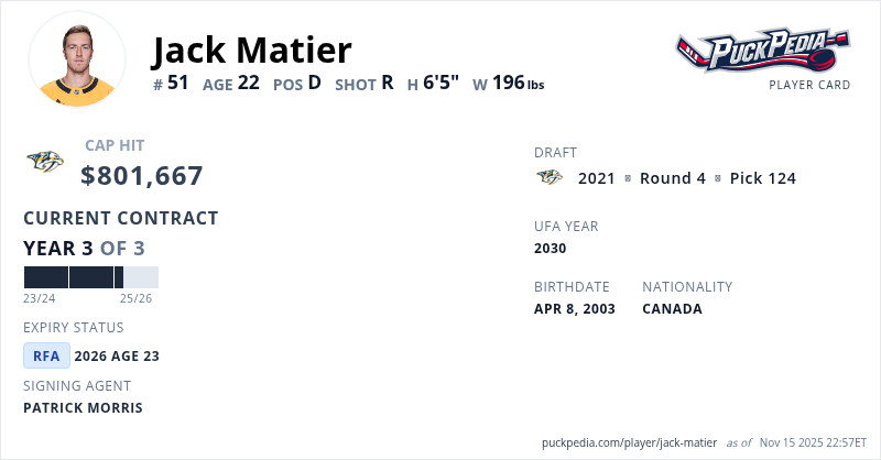 Jack Matier is signed to a 3 year, $2,405,001 contract with a cap hit of $801,667 per season, playing for the Nashville Predators. His contract expires at the end of the 2025-26 season, making Matier a Restricted Free Agent.