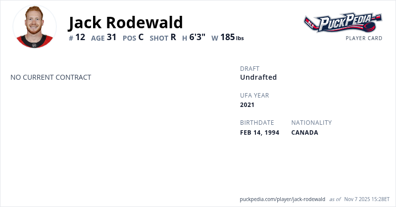 Jack Rodewald is an Unrestricted Free Agent. His last contract was 1 year, $725,000 with a cap hit of $725,000 per season. It expired at the end of the 2019-20 season.