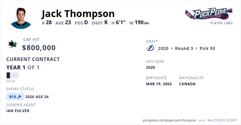 Jack Thompson is signed to a 1 year, $800,000 contract with a cap hit of $800,000 per season, playing for the San Jose Sharks. His contract expires at the end of the 2025-26 season, making Thompson a Restricted Free Agent.