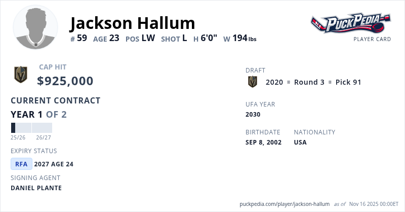 Jackson Hallum is signed to a 2 year, $1,850,000 contract with a cap hit of $925,000 per season, playing for the Vegas Golden Knights. His contract expires at the end of the 2026-27 season, making Hallum a Restricted Free Agent.