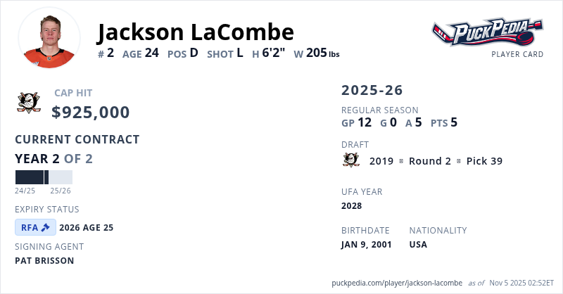 Jackson LaCombe is signed to a 8 year, $72,000,000 contract extension with a cap hit of $9,000,000 per season. He plays for the Anaheim Ducks. His next contract begins for the 2026-27 season and expires at the end of the 2033-34 season, making him an Unrestricted Free Agent.
