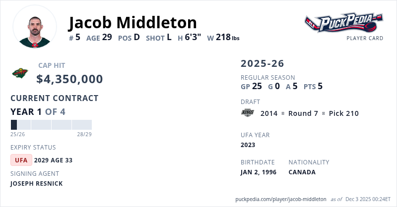 Jacob Middleton is signed to a 4 year, $17,400,000 contract with a cap hit of $4,350,000 per season, playing for the Minnesota Wild. His contract expires at the end of the 2028-29 season, making Middleton an Unrestricted Free Agent.