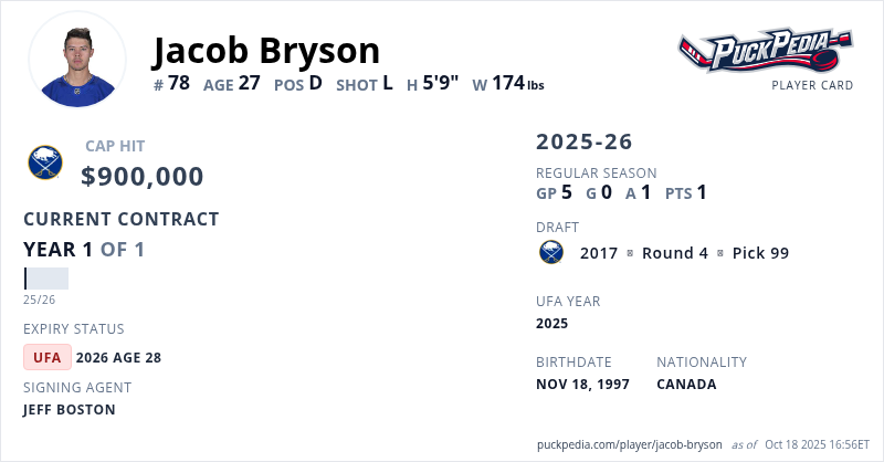 Jacob Bryson is signed to a 1 year, $900,000 contract with a cap hit of $900,000 per season, playing for the Buffalo Sabres. His contract expires at the end of the 2025-26 season, making Bryson an Unrestricted Free Agent.
