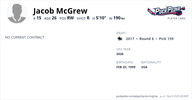 Jacob McGrew is an Unrestricted Free Agent (No Qualifying Offer). His last contract was 3 years, $2,315,001 with a cap hit of $771,667 per season. It expired at the end of the 2021-22 season.