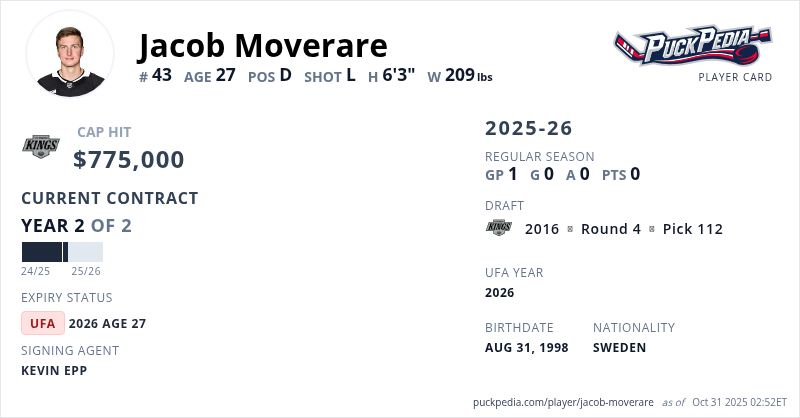 Jacob Moverare is signed to a 2 year, $1,550,000 contract with a cap hit of $775,000 per season, playing for the Los Angeles Kings. His contract expires at the end of the 2025-26 season, making Moverare an Unrestricted Free Agent.