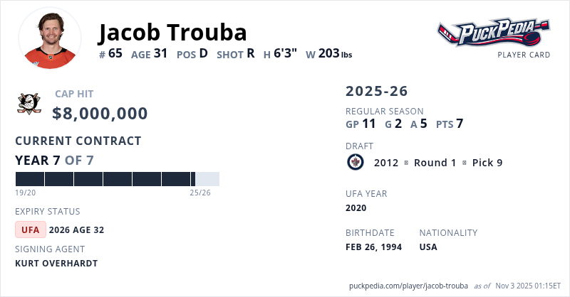 Jacob Trouba is signed to a 7 year, $56,000,000 contract with a cap hit of $8,000,000 per season, playing for the Anaheim Ducks. His contract expires at the end of the 2025-26 season, making Trouba an Unrestricted Free Agent.