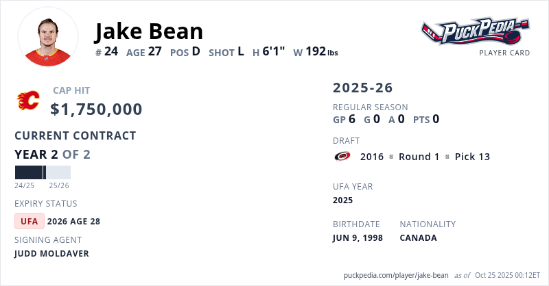 Jake Bean is signed to a 2 year, $3,500,000 contract with a cap hit of $1,750,000 per season, playing for the Calgary Flames. His contract expires at the end of the 2025-26 season, making Bean an Unrestricted Free Agent.
