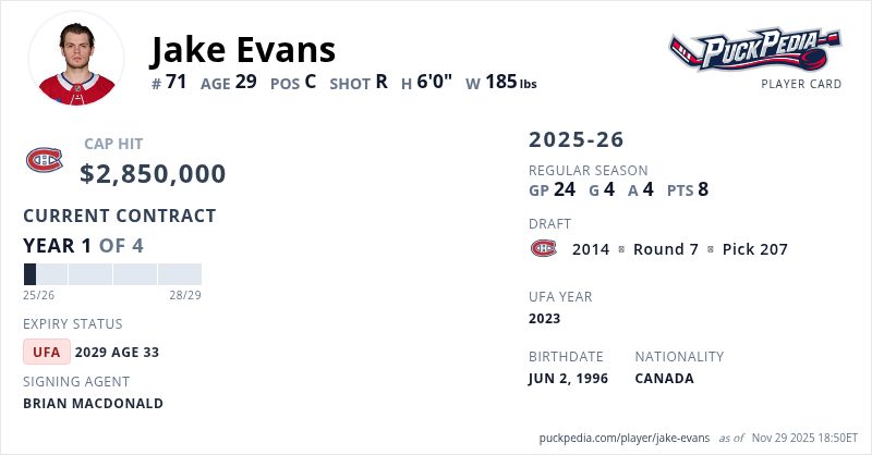 Jake Evans is signed to a 4 year, $11,400,000 contract with a cap hit of $2,850,000 per season, playing for the Montreal Canadiens. His contract expires at the end of the 2028-29 season, making Evans an Unrestricted Free Agent.