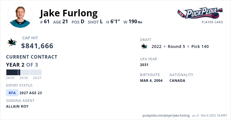Jake Furlong is signed to a 3 year, $2,524,998 contract with a cap hit of $841,666 per season, playing for the San Jose Sharks. His contract expires at the end of the 2026-27 season, making Furlong a Restricted Free Agent.