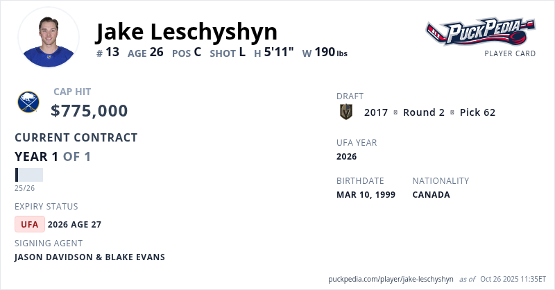 Jake Leschyshyn is signed to a 1 year, $775,000 contract with a cap hit of $775,000 per season, playing for the Buffalo Sabres. His contract expires at the end of the 2025-26 season, making Leschyshyn an Unrestricted Free Agent.