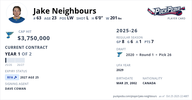 Jake Neighbours is signed to a 2 year, $7,500,000 contract with a cap hit of $3,750,000 per season, playing for the St. Louis Blues. His contract expires at the end of the 2026-27 season, making Neighbours a Restricted Free Agent.